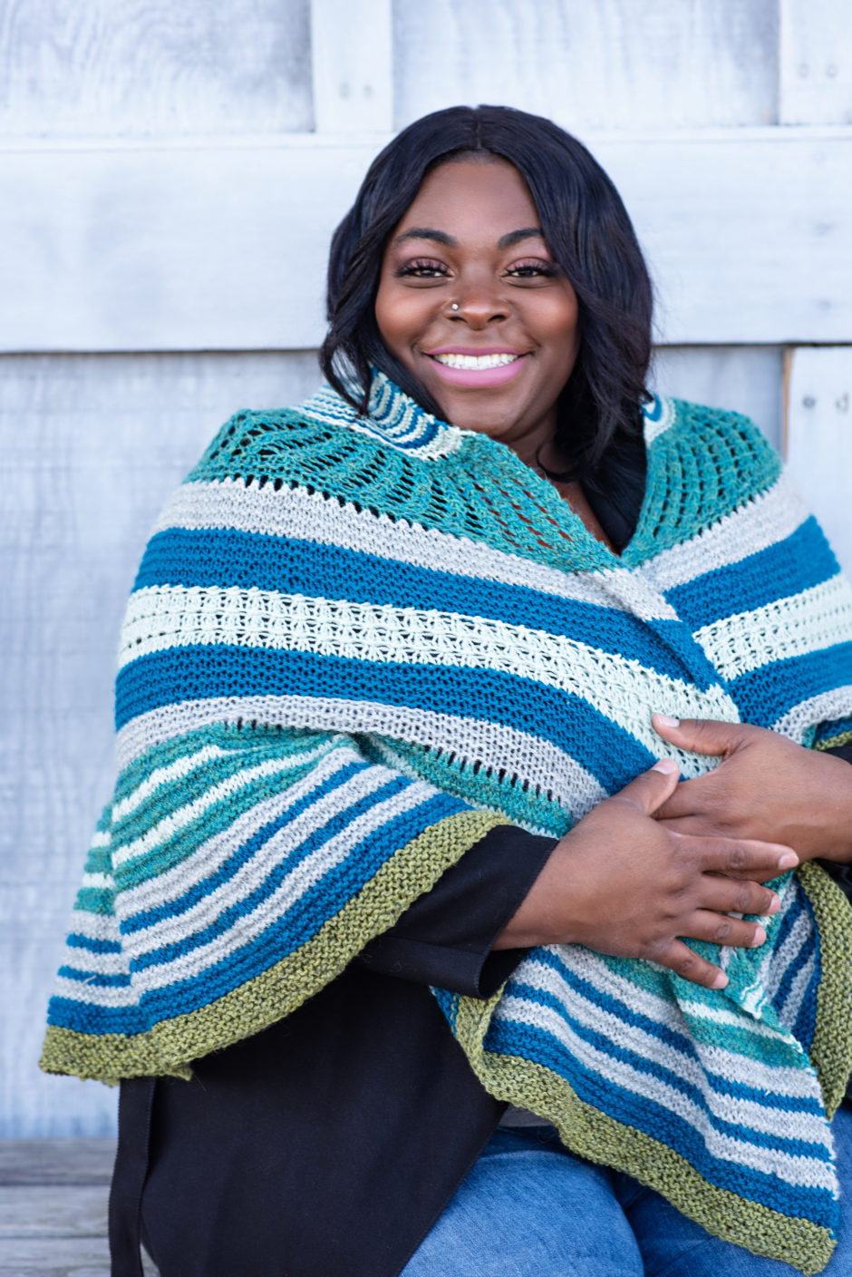I know that everyone’s worried about inflation and cost so I’d like to emphasize that this pattern can be knit economically. The sample was knit in Cascade 220 Sport, which costs around $5.50 to $6.50 per skein. Ten skeins (and you’ll have some leftovers) will cost $55 to $65 dollars (less if you can nab a sale or discount) — and the shawl is huge! You can, of course, substitute your own sport weight yarn choice (Cat. 2) and/or reduce the number of colors to trim down the price. Given the large size, I’d suggest something with at least some wool to avoid sagging and to keep the shawl relatively lightweight.